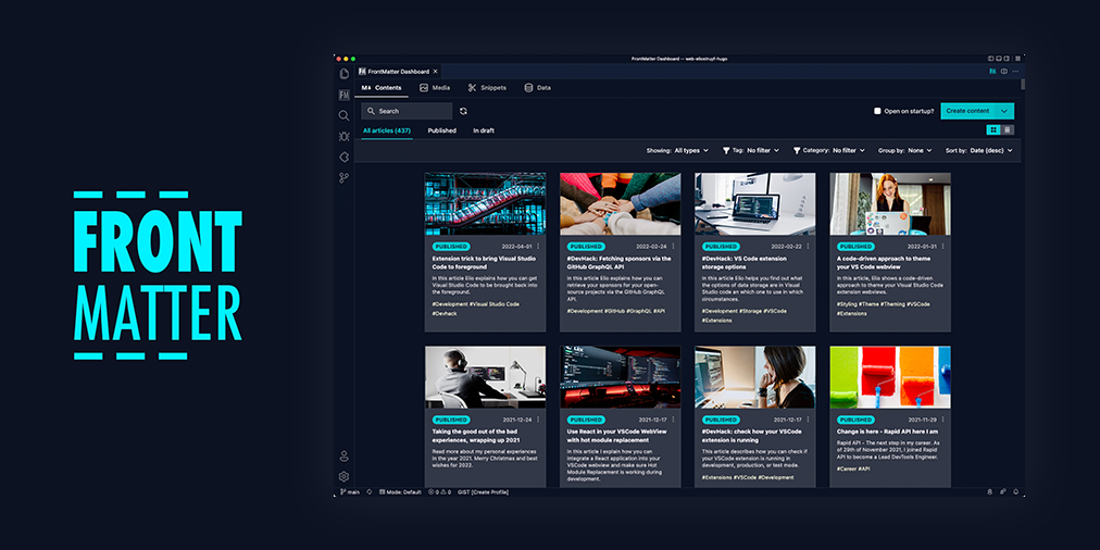 Headless CMS right in your code editor | Front MatterHeadless CMS running in Visual Studio Code that helps managing your static sites. Supports Hugo, Jekyll, Docusaurus, NextJs, Gatsby, and more.