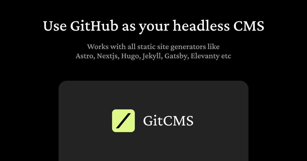 GitCMS: A Git-based and headless CMS for Astro, Next.js, Hugo, Jekyll, Eleventy, Gatsby, etc. A Git-based and headless CMS for Astro, Next.js, Hugo, Jekyll, Eleventy, Gatsby, etc.