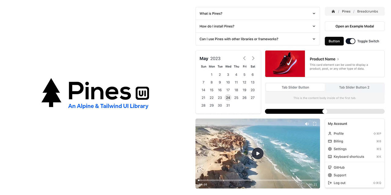 Pines - Alpine and Tailwind UI LibraryPines is a library of animations, sliders, tooltips, accordions, modals, and more!
